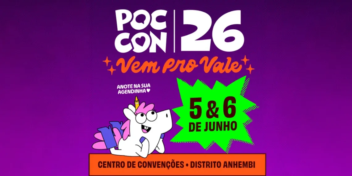 A Poc Con 2026 acontece nos dias 5 e 6 de junho, das 12h às 20h, no Centro de Convenções do Distrito Anhembi, em São Paulo. A entrada é gratuita.