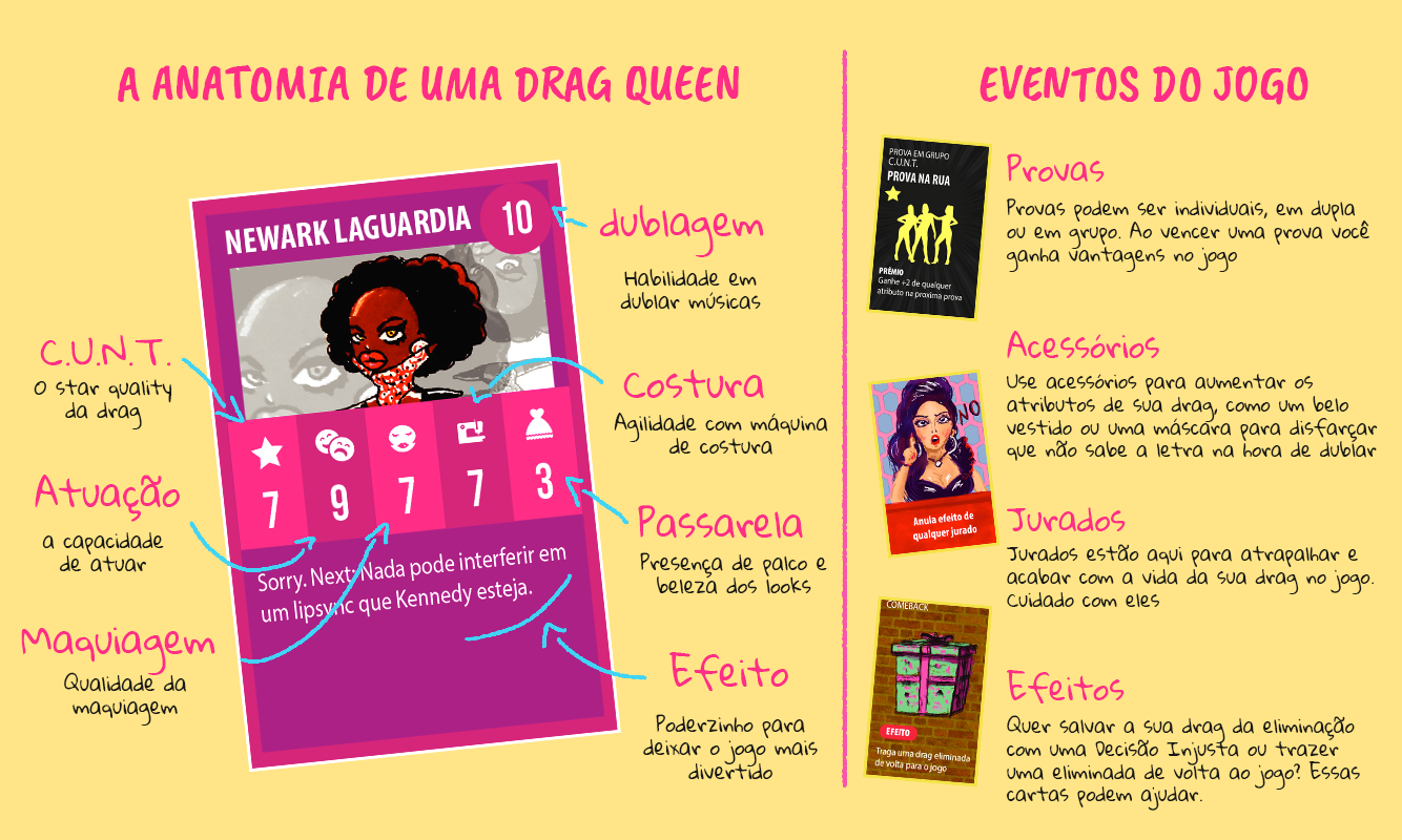 O jogo virá com um manual detalhado com a jogabilidade, mas resumindo: As cartas são divididas em duas grandes categorias: Drag Queens e Eventos.