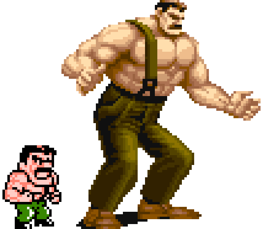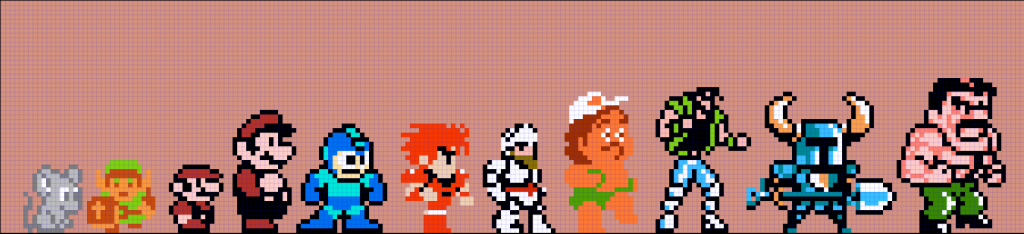 Nessa imagem temos um comparativo entre os tamanhos de vários heróis de jogos de Nintendinho, do minúsculo maguinho de Micro Mages (um jogo moderno mas que foi feito para ser rodado no console original) com 8×7 pixels até o “gigantesco” Haggar de Mighty Final Fight com 24×34 pixels (só pra comparação, o sprite de Haggar do Arcade tem 81×93 pixels).