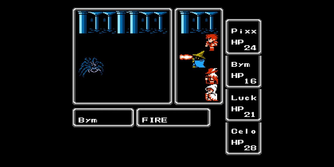 É assim que se parece a tela de batalha do primeiro jogo, já inaugurando o estilo da franquia de colocar os heróis visíveis de um lado da tela e os inimigos de outro (Dragon Quest e Phantasy Star, por exemplo, deixavam em visão de primeira pessoa e só os monstros eram visíveis).