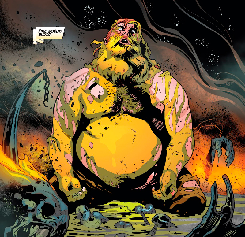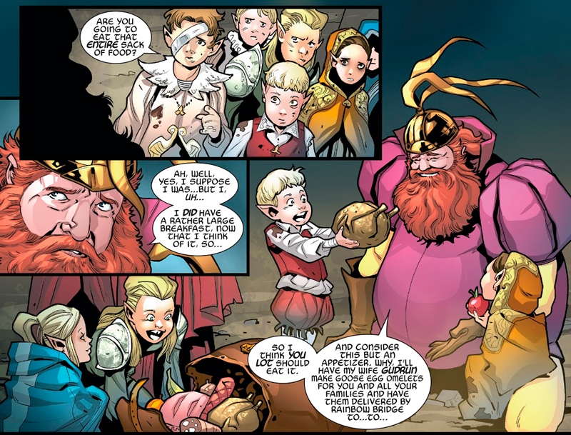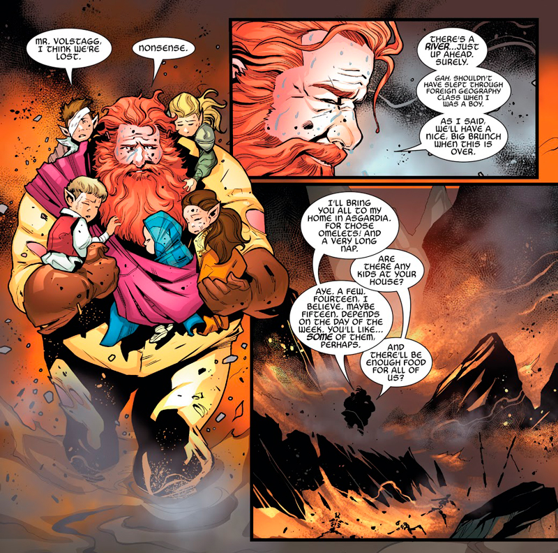 Volstagg é um dos poucos asgardianos que tem família e filhos. É visível o desespero dele em tentar levar as crianças para um local seguro. E fez todo o sentido para mim ele se desconcertar diante da morte delas. Aquele Volstagg brincalhão de antes está morto, só nos resta essa nova máquina de matar ambidestra movida a ódio.