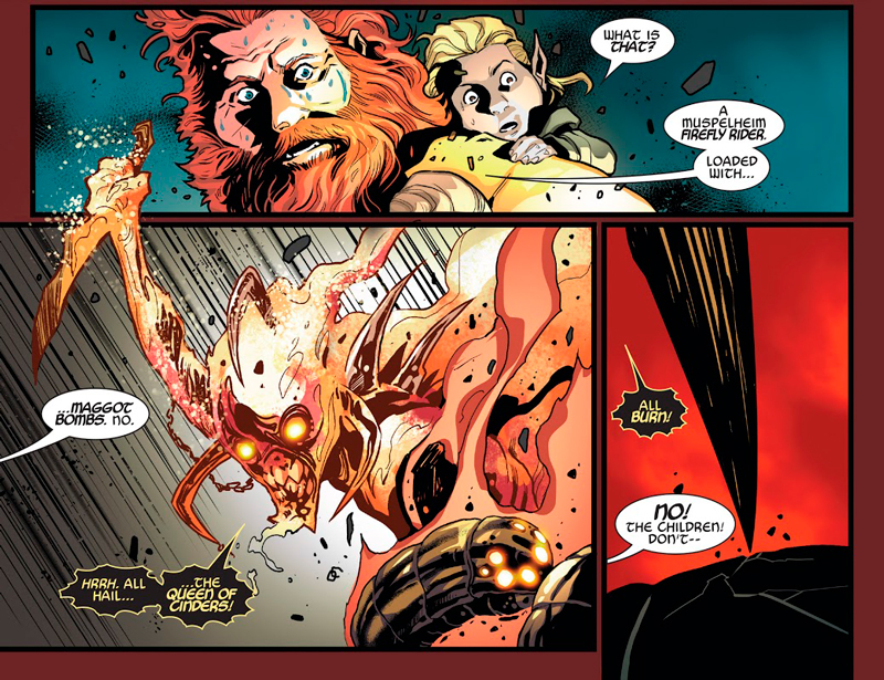 Só que quando estava perto de escapar em segurança, aparece a criatura que atacou, um Lacaio de fogo de Mulpelhein, que explode umas bombas, dizimando a área. Volstagg resiste a explosão, mas as crianças são dizimadas.